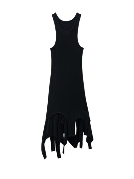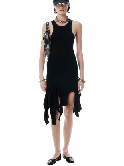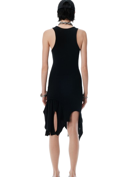 Alexander Wang Black Cotton Deconstructed Minidress.Asymmetrical godets and a handkerchief hem accentuate the deconstructed look of this black drop-waist mini tank dress.