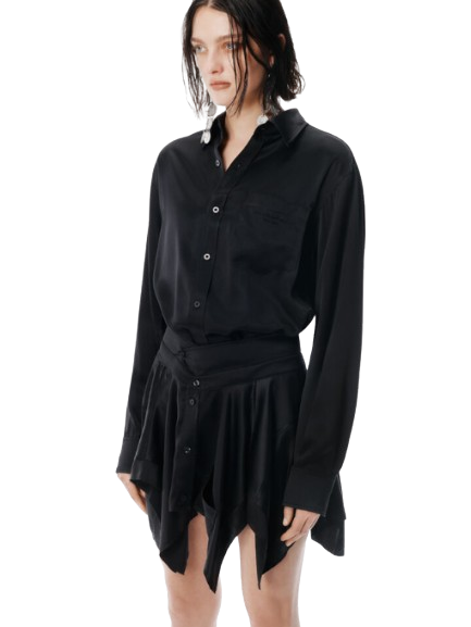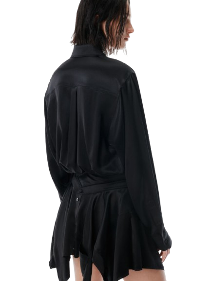 Alexander Wang Black Silk Pre-Styled Double Shirtdress.Pre-styled shirt dress constructed in black silk charmeuse, built from an oversized shirt silhouette with a deconstructed, multi-shirt skirt. Two shirts are buttoned together to form the skirt, with raw-cut sleeves and turned-up collars creating an uneven hem and waistband. Finished with classic logo embroidery at the chest pocket.