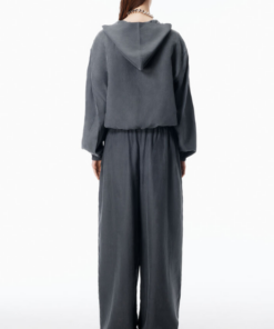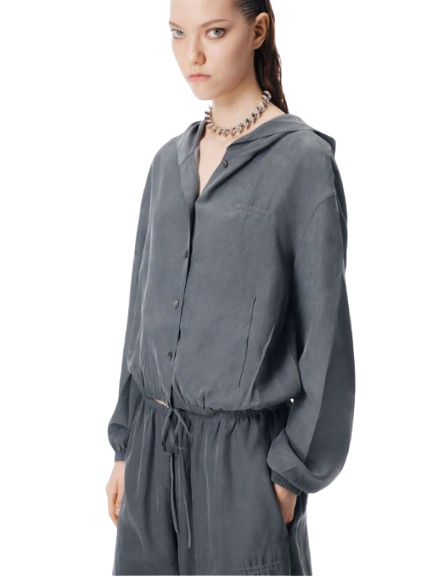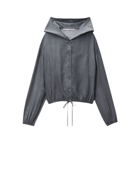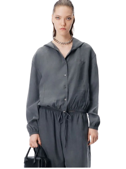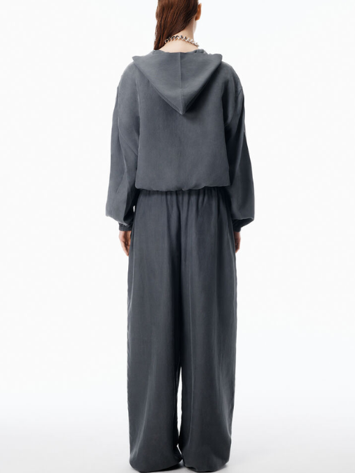 Alexander Wang Cropped Hoodie in Silk.Thunder grey cropped hoodie in pigment-coated silk. The relaxed silhouette meets elevated fabrication, balancing laid-back ease with polished finish.