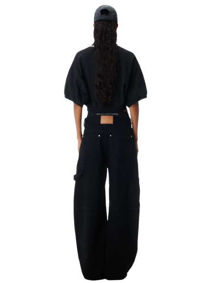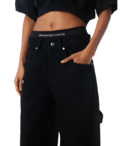 Alexander Wang Pre-Styled Mid-Rise Jean Oversized.Washed black chunky twill denim shaped into a mid-rise oversized wide leg. Finished with an attached logo elastic boxer-brief combo, carpenter details, oversized back pockets, and a tan logo patch at the center back.