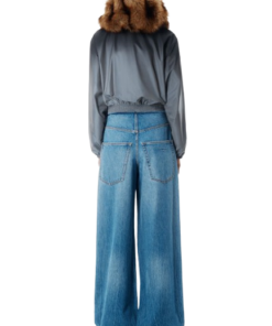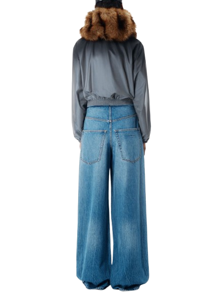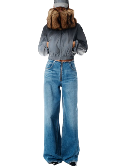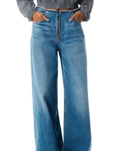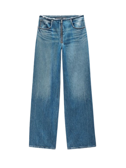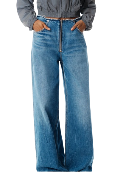 Alexander Wang Surge Wide Leg Jean.Vintage marbled blue denim reimagined in a low-rise wide leg silhouette. Designed with an exposed front zipper and raw cut waist for a modern attitude.