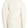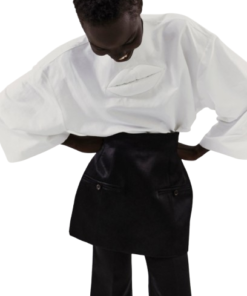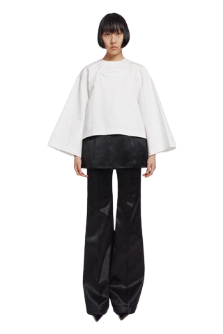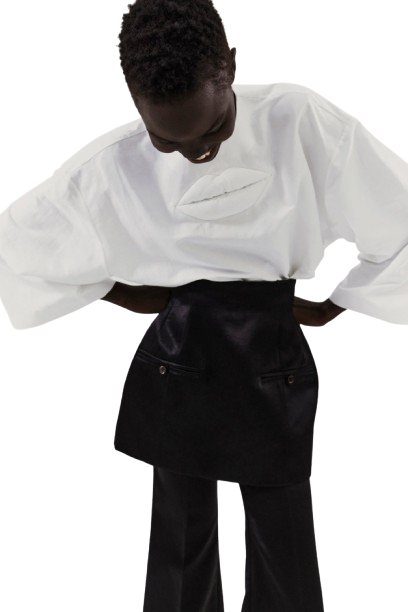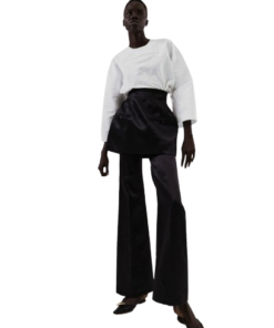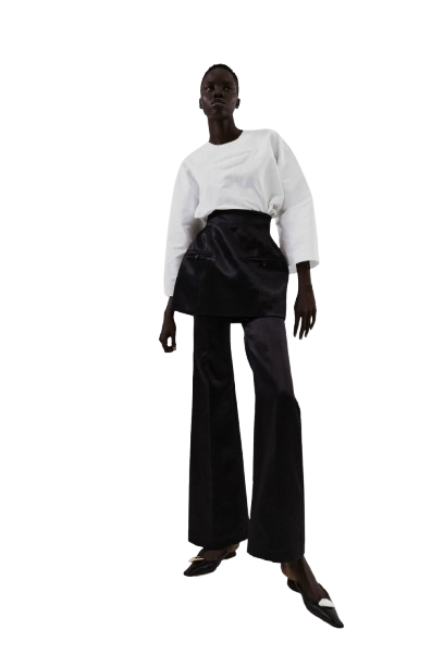 Awake-Mode Basque Tailored Trousers Black.Flared trousers featuring our signature basque detailing. These high-waisted trousers combine traditional suiting elements with a subtle sheen, exuding both sophistication and playfulness. The structured high waist and straight lines elegantly elongate the silhouette, while the signature basque detailing adds a distinctive touch.