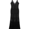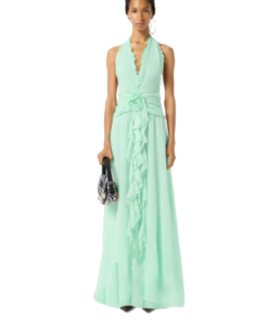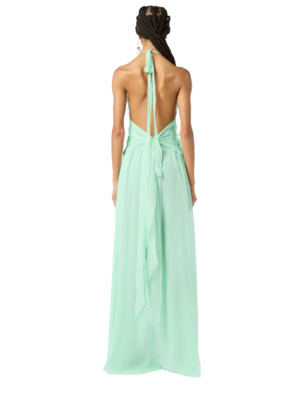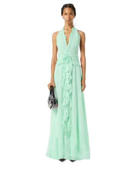 Blumarine Long Viscose Georgette Dress With Rose And Ruffles In Green Lily.Long viscose georgette dress with a halterneck, a fabric rose detail with flounces, a front slit, and a deep neckline on the back.