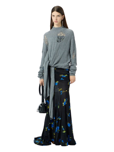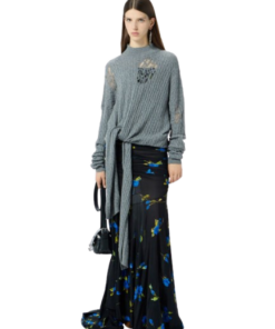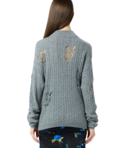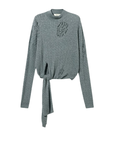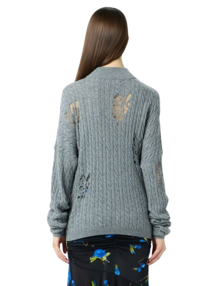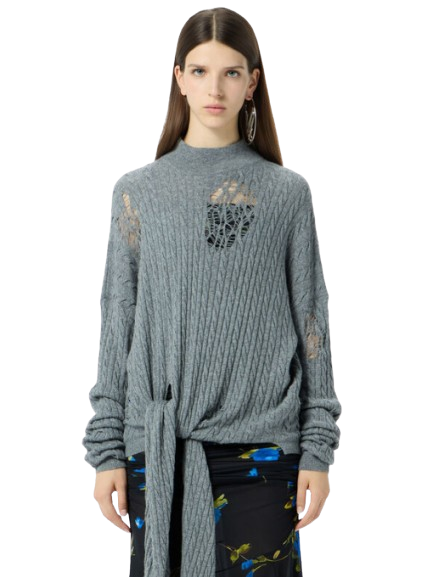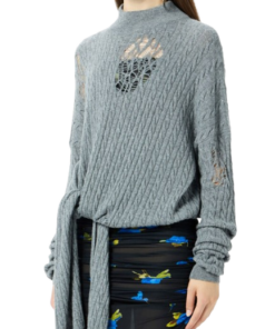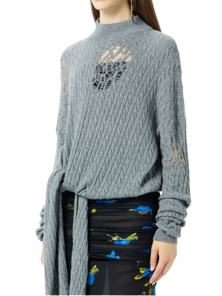Blumarine Twisted Knit Sweater With Front Knot.Grandad-neck sweater in twisted yarn with distressed details and long ties to knot at the waist.Made in Italy.