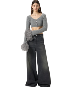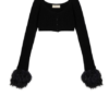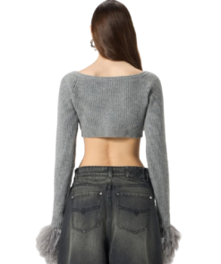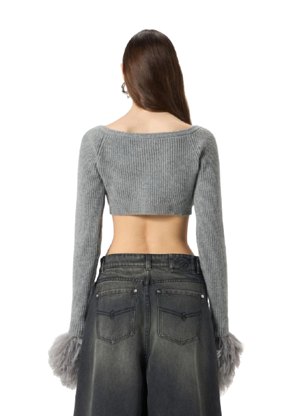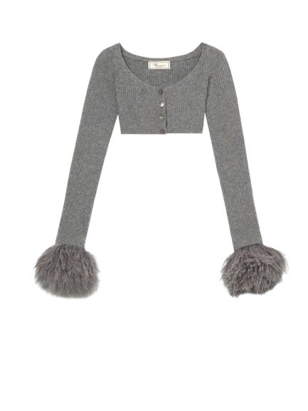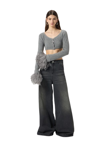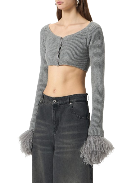 Blumarine Wool Cardigan With Feathers In Grey.Cropped cardigan in ribbed wool with wide neckline and feather-trimmed Cuffs.Button closure.
