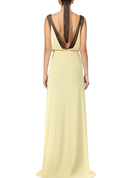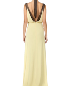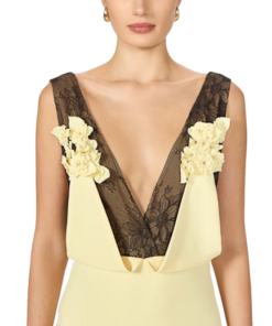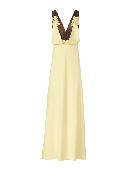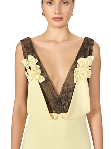 Costarellos Janessa Crepe Lace Plunge Neck Gown In Yellow.A graceful soft yellow crepe gown featuring a plunging neckline and Chantily lace on the upper part, adorned with floral appliqué.