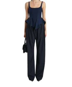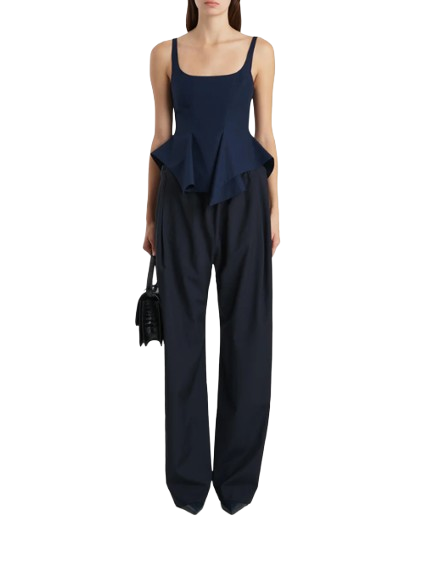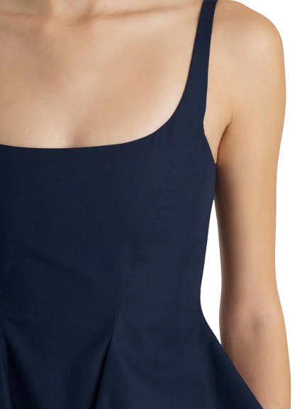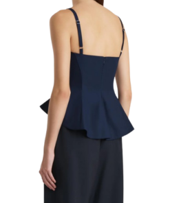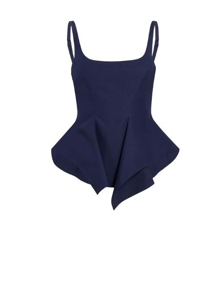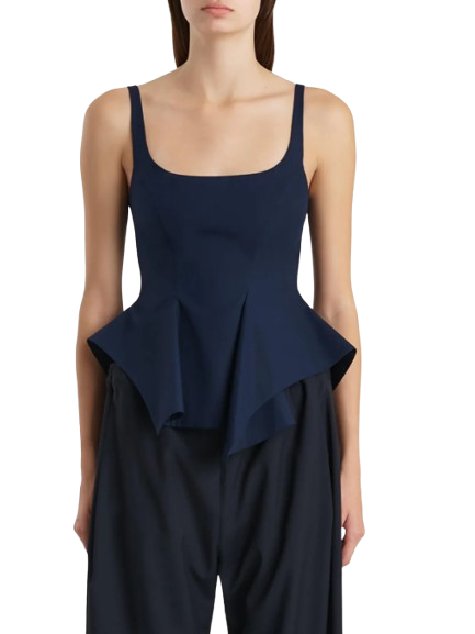 Khaite Loa Top.A sleeveless peplum top of sculpted fluidity. Made in Italy of crisp and lightweight cotton poplin selected for its clean, classic finish. Framed by adjustable straps and a scooped neckline, the silhouette is fitted at the bust, flaring from the waist into draped volume with a handkerchief hem. Concealed zipper closure at back.