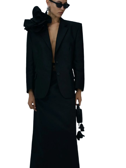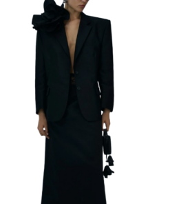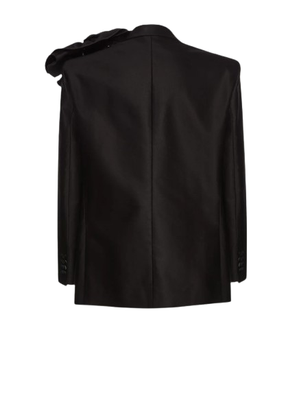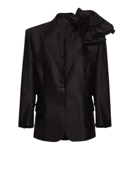 Magda Butrym Classic Flower Applique Blazer In Black.A classic oversized blazer with strong shoulders and a removable rose appliqué brooch for a feminine and undeniably Magda Butrym look. This season, the blazer is available in lightweight cotton.