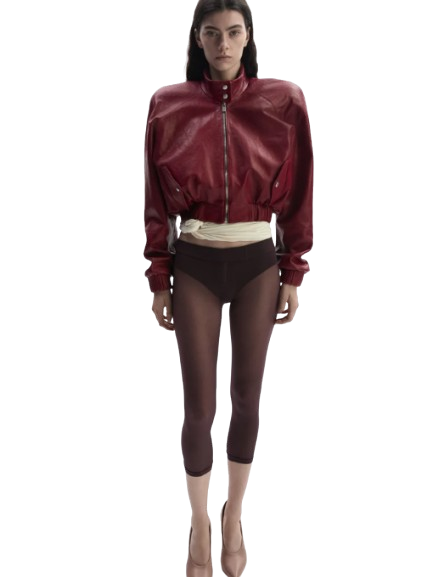 Magda Butrym Cropped Leather Bomber Jacket In Cherry Red.Cropped jacket crafted from soft leather with a relaxed bomber silhouette. Designed with a high stand collar, front zip closure, and ribbed knit cuffs and hem for a subtle blouson effect. Features side flap pockets with snap buttons and a gently structured shape that balances volume and femininity. Finished with an embossed logo detail at the back.