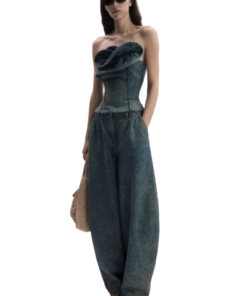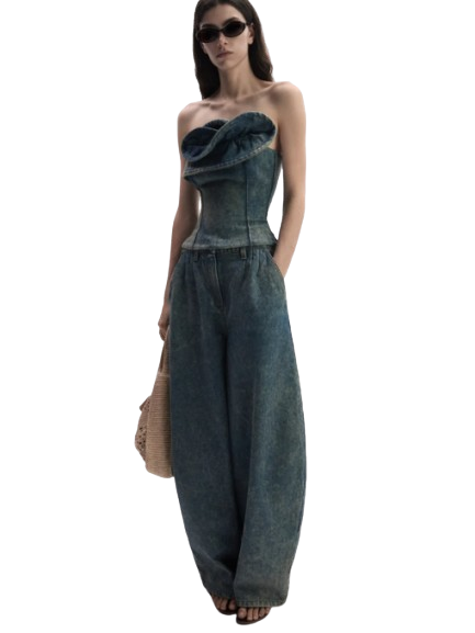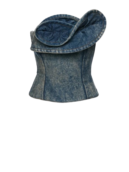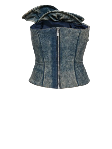 Magda Butrym Denim Corset With Sculptural Neckline In Vintage Blue.Designed with internal boning along the seams for sculpted support and a fitted silhouette. The front is adorned with an intricate petal-like overlay shaped to resemble a blooming rose. Finished with a metal zip closure at the back.
