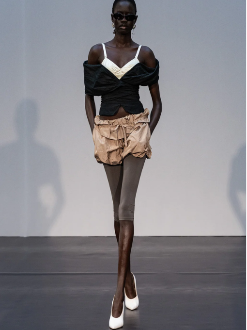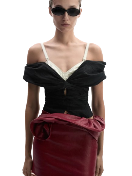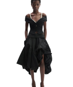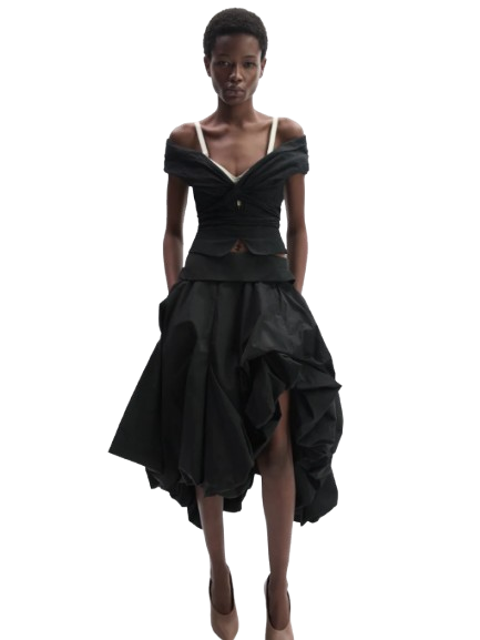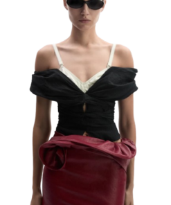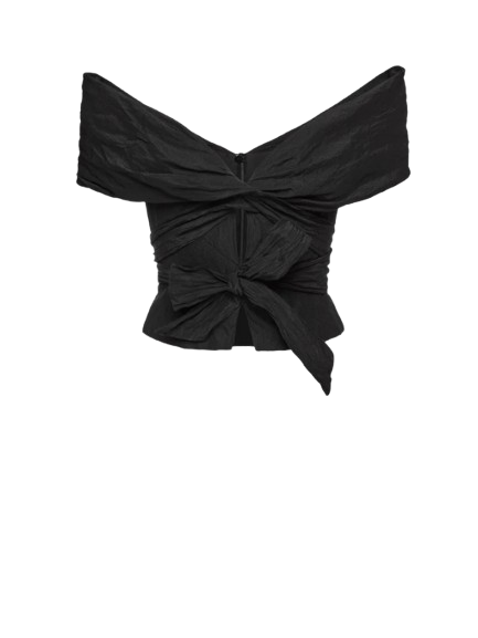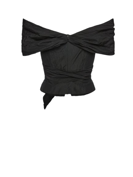 Magda Butrym Draped Off Shoulder Blouse In Black.A romantic blouse featuring a wide draped collar that falls into an off shoulder neckline at both front and back. The silhouette is cinched at the waist, supported with inner boning for structure, and finished with a full lining. Elastic straps beneath the shoulders ensure stability, while long ties can be styled at the front or back for a versatile finish. Secures with a concealed zip and inner button closure.