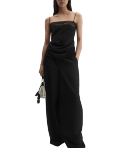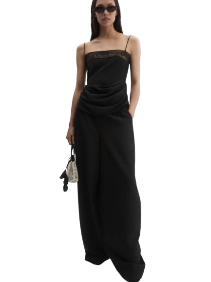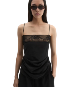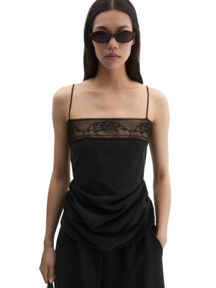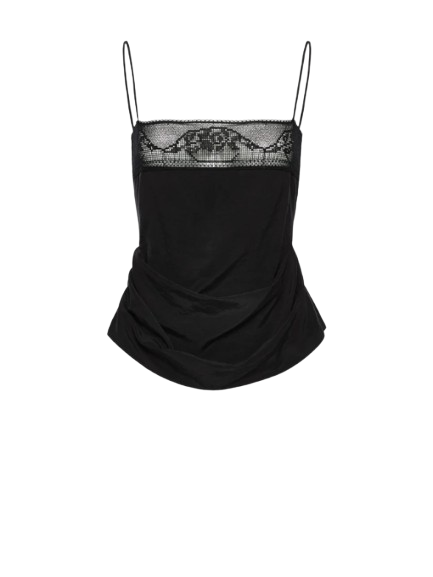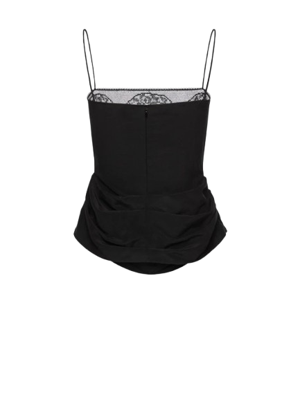 Magda Butrym Draped Silk-Lace-Trim Top In Black.A delicate silk top suspended from fine straps, featuring a straight neckline adorned with sheer floral lace. Draped side folds create a soft, sculptural silhouette that flatters the form. Finished with a concealed zip at the back.