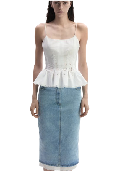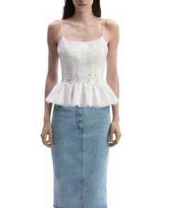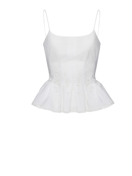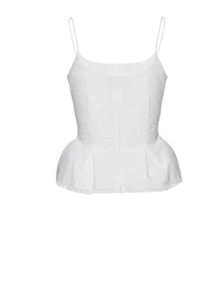 Magda Butrym Embroidered Peplum Top In White.A delicately embroidered top crafted with thin straps and a sculpted, waist-defining silhouette. Fitted through the bodice, it flares gently below the waist into a soft peplum, subtly enhanced with padded hips for a couture-inspired shape. Finished with decorative lace at the hem and a concealed zip closure at the centre back.