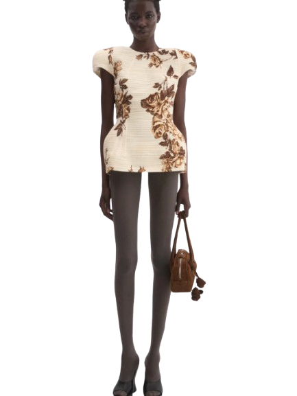 Magda Butrym Fitted Floral Print Top In Cream.A sculpted short-sleeve blouse featuring a delicate rose print on a softly textured base. Designed with a round neckline and a precisely tailored waist accentuated by darts. Light padding at the shoulders and hips enhances the feminine silhouette. Fully lined for structure and comfort, the piece closes at the back with a concealed zip.