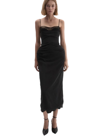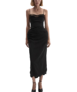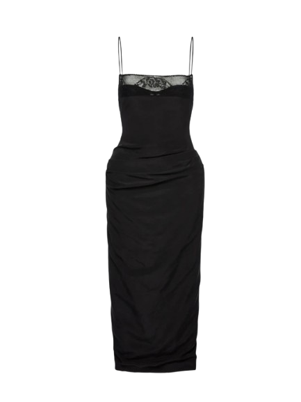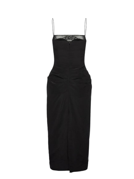 Magda Butrym Midi Corset Dress With Lace Neckline In Black.A mid-length fitted dress crafted from lightly crinkled silk. Features thin shoulder straps and a straight neckline trimmed with delicate lace. A built-in corset provides structure and is subtly visible through the lace panel at the front. The silhouette is softly draped with side and back gathers, accentuating the shape. The hips are enhanced with internal padding. Fastens at the back with a concealed zipper and a slit for ease of movement. The inner hem is detailed with a silk placket edged in fine lace.