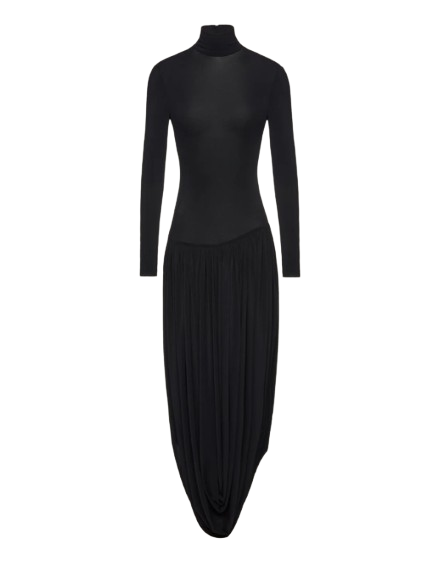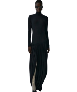Magda Butrym Open-Leg Long-Sleeve Draped Maxi Dress In Black.A long, figure-hugging gown with a high turtleneck collar and full-length sleeves. The sleek silhouette is contrasted by a voluminous draped skirt gathered at the hips, featuring open panels along the front and sides that add movement and a subtle reveal. Crafted with a stretch bodice and a lightweight draped lower half for a modern, fluid finish. Closed at the back with an invisible zip.