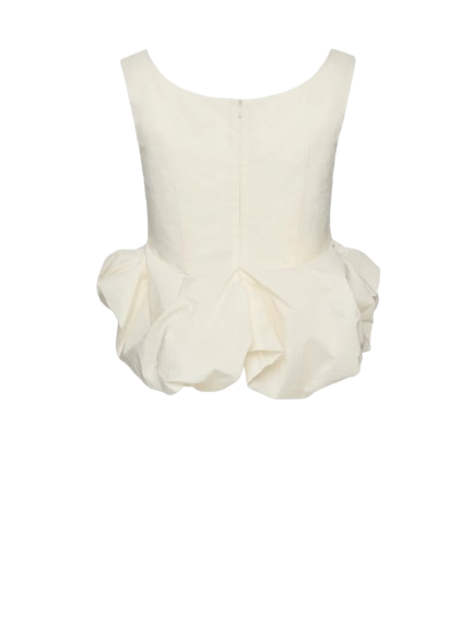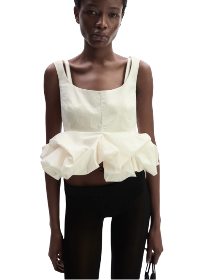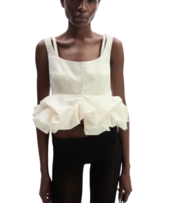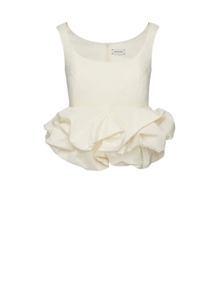 Magda Butrym Peplum Tank Blouse In Cream.A sleeveless blouse with wide straps and a softly scooped neckline. Fitted through the waist with dart detailing, the silhouette flares out into a voluminous peplum created by tightly gathered fabric folds. Finished with a concealed zip closure at the back and a delicate lace-trimmed interior waistband.