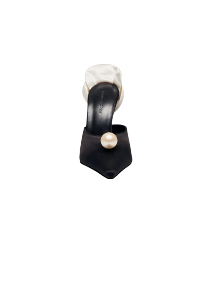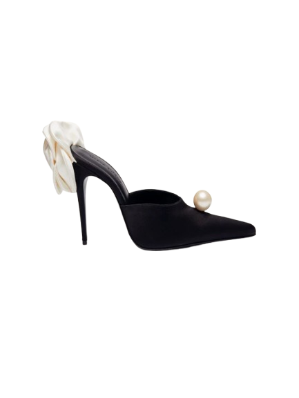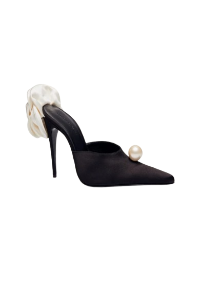 Magda Butrym Pointed Flower Mules in Black Satin.Made in Italy, these pointed toe mules are set atop a 110mm heel and feature Magda’s signature 3D flower at the heel. As an extra detail, a large faux pearl adorns the front.