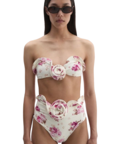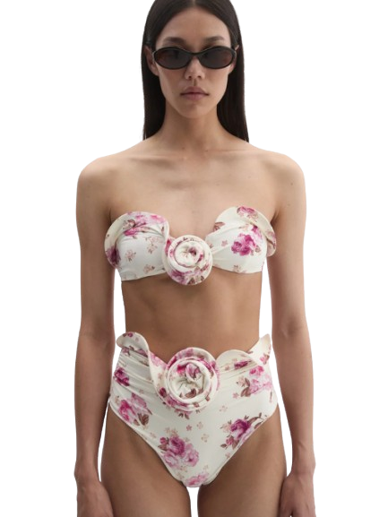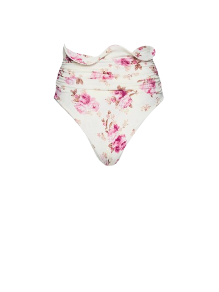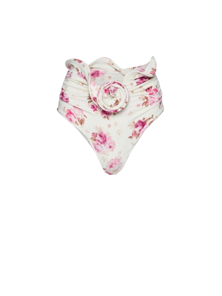 Magda Butrym Sculpted Waist Swim Bottom In Cream Floral Print.This high-waist swim bottom features a flattering ruched design with a rosette accent in the center, adding a feminine and sophisticated touch. Perfect for mixing and matching with your favorite swim tops.