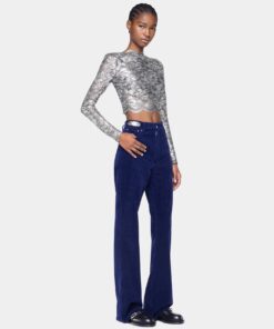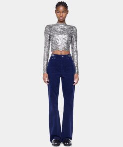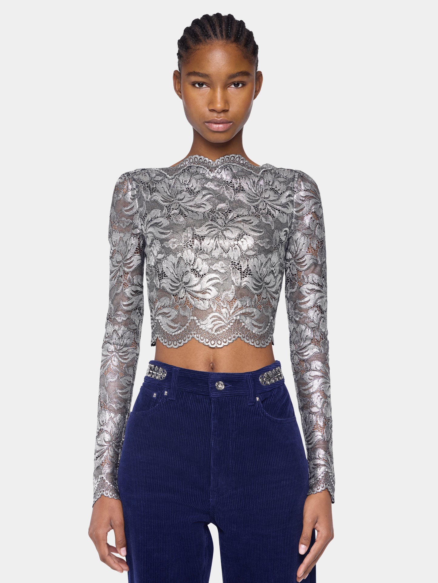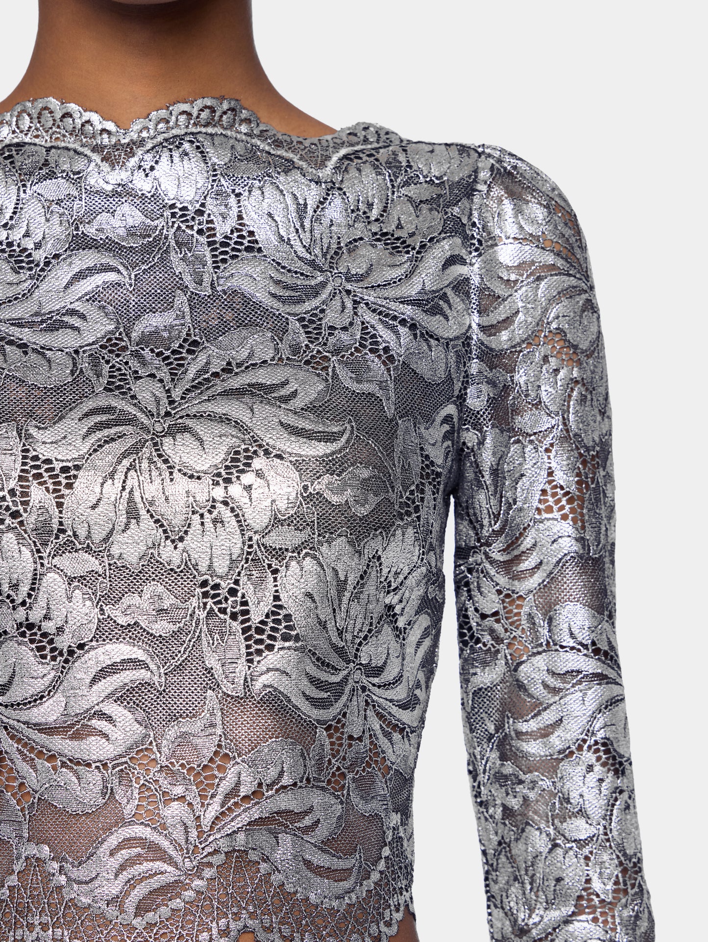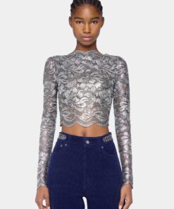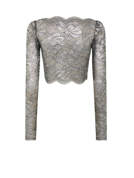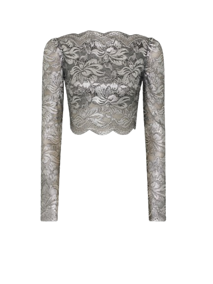 Rabanne Cropped Top In Lace Silver.Long sleeves cropped top in lace with silver foil coating.Boat neck with long sleeves and cropped length.