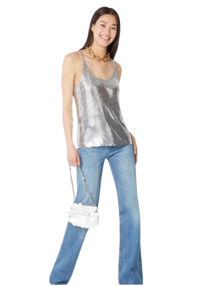 Rabanne Silver Chainmail Top.Silver mesh tank top in aluminum.The mini tank top is made of silver mesh and designed with thin straps that hugs your body perfectly. This lightweight and fluid tank top celebrates one of the iconic materials from the Maison Rabanne, mesh, making it a Rabanne essential item.