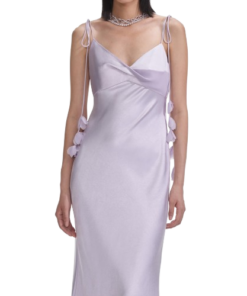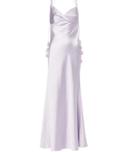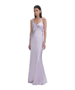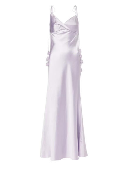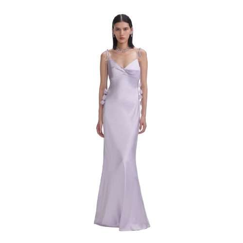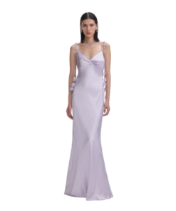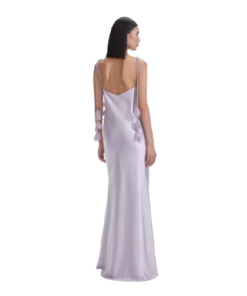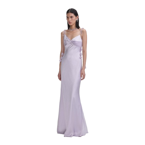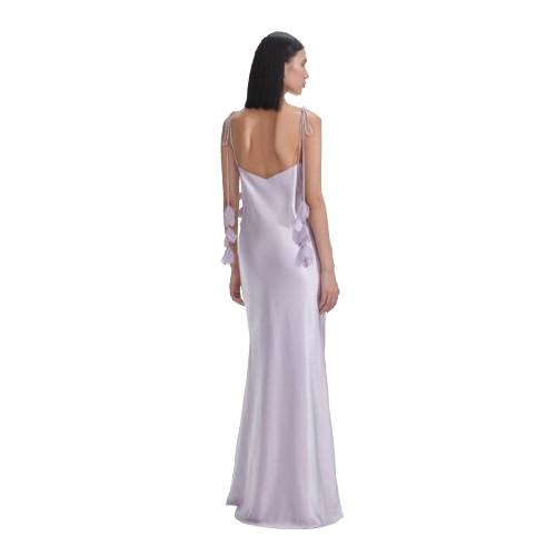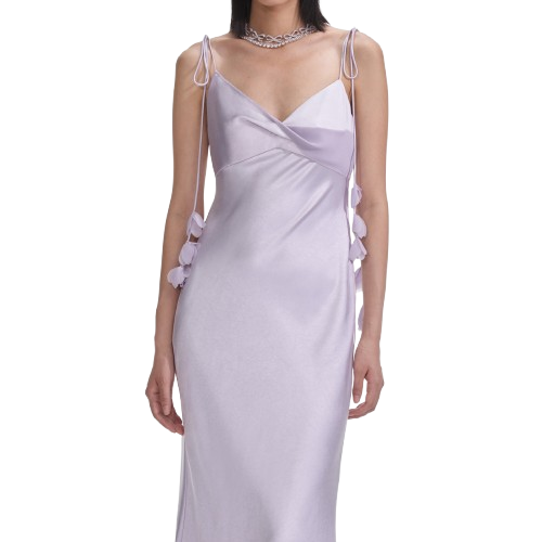 Self Portrait Lilac Flower Satin Maxi Dress.This satin dress exudes understated elegance with its minimalist silhouette and flowing maxi skirt. Highlighted by bust detailing, delicate floral motifs add extra romance to the ethereal look.