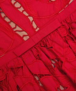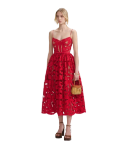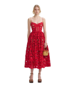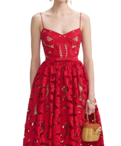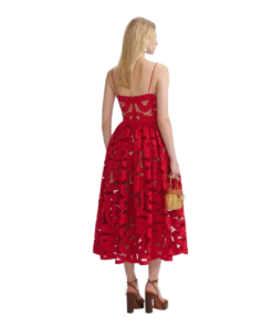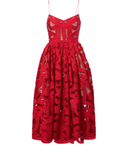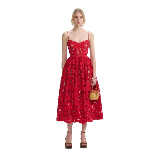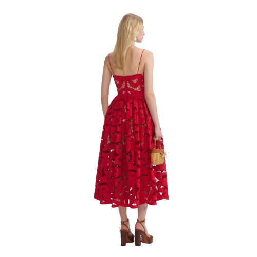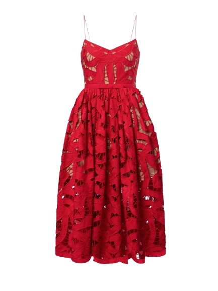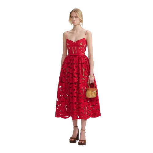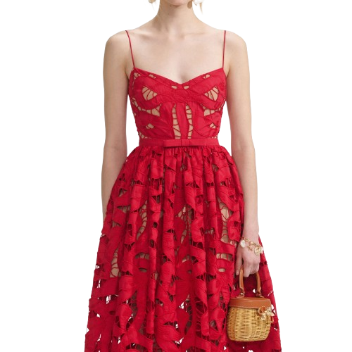 Self-Portrait Red Bow Embroidered Midi Dress.Cut from cotton linen, raise the temperature in this red hot midi dress. A flattering sweetheart neckline and bow motif belt add extra intrigue – show off its full skirt with a pair of heels.