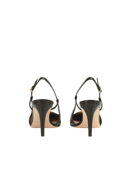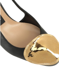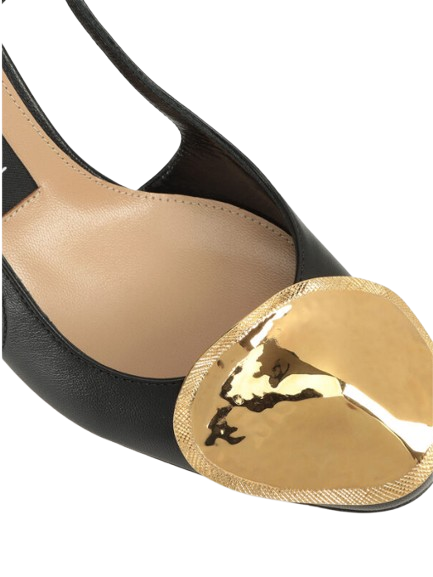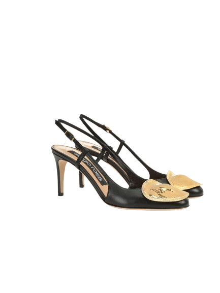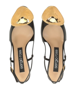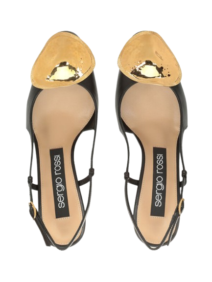 Sergio Rossi Diani Slingbacks Black.An iconic design from the archives, a hammered gold embellishment elevates these simple sr Diani slingbacks in black leather. For a style that’s certain to make its mark.