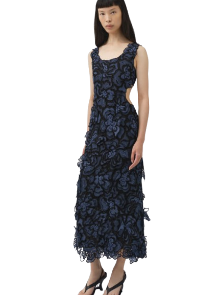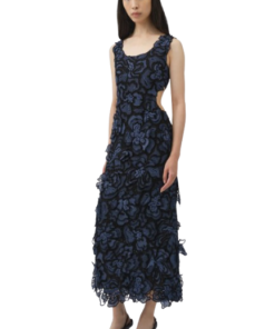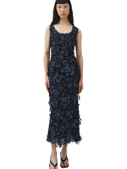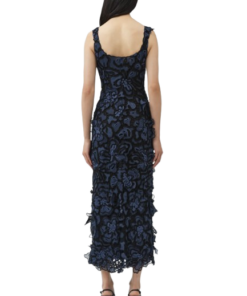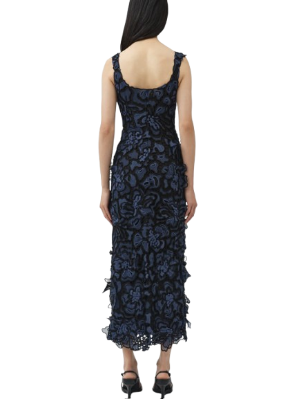 Simkhai Corinna Lace Midi Dress.The Corinna Lace Midi Dress in Dark Indigo Multi.Rendered in coated guipure lace, this sleeveless silhouette features dimensional floral motifs and a delicate scoop neckline. Layered appliqué highlights the lace’s intricate texture, while a full length tonal lining provides coverage.